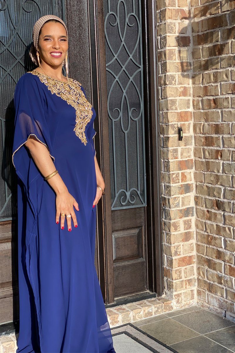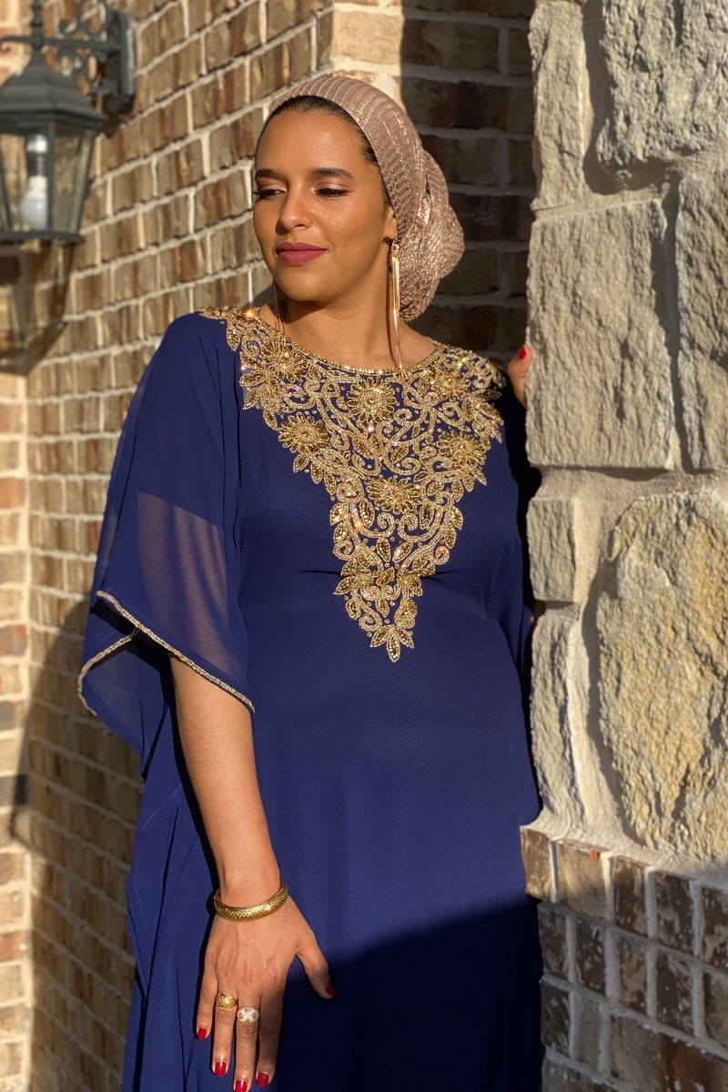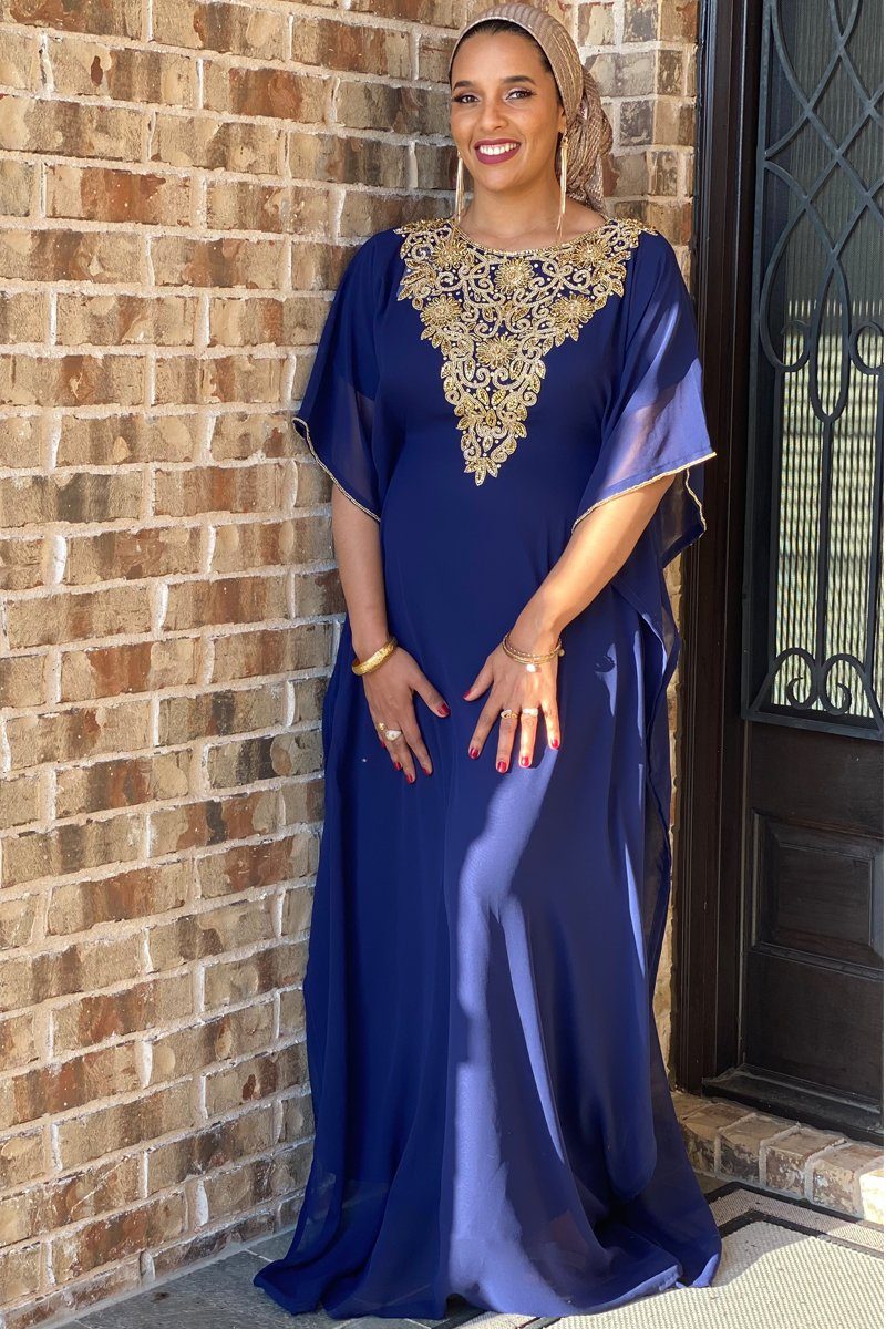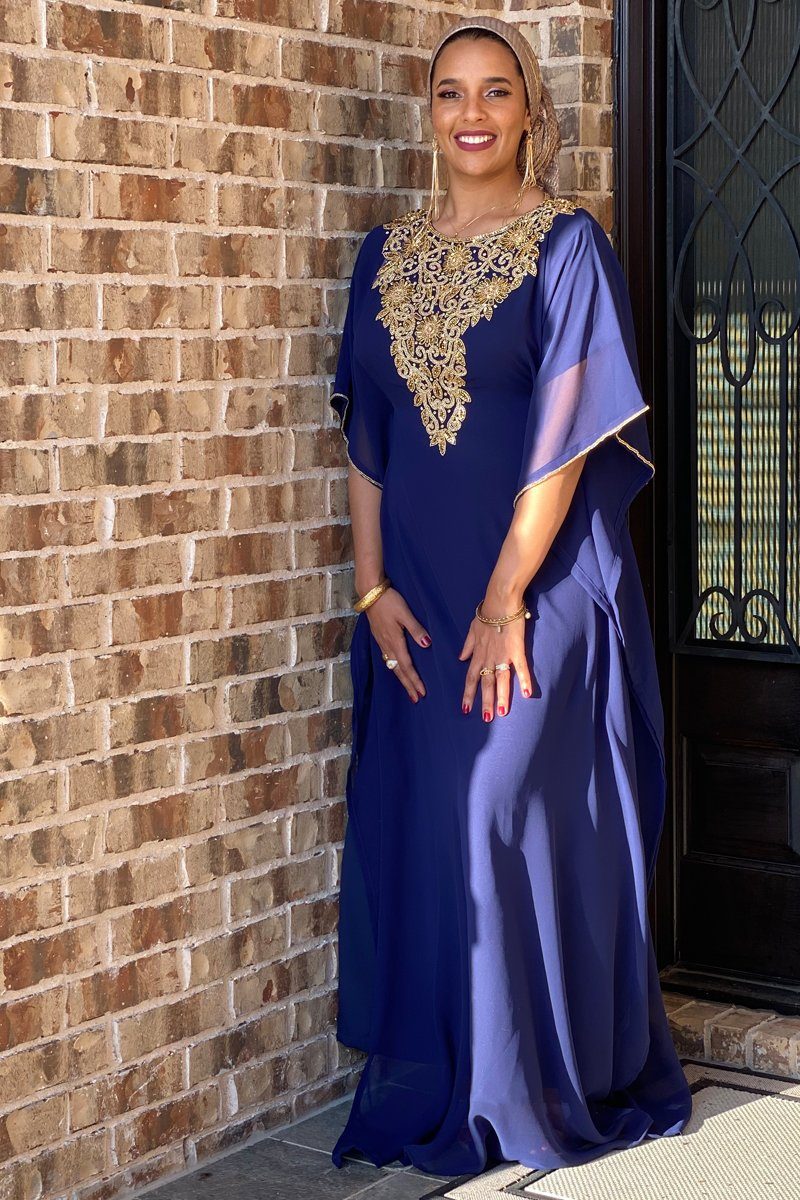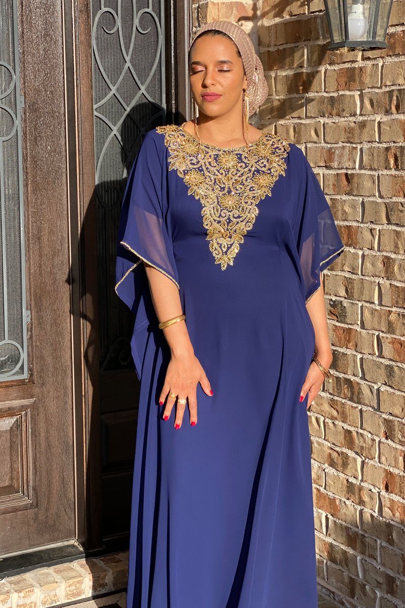 Our new Raeka Kaftan invokes all the stately glamour of the mythic with which it shares its name. The dreamy colors, along with the ornate gold detailing reveals a gentle power that makes this kaftan a striking one. You are sure to command an entrance when you enter room in the Raeka Kaftan which features embellishments along the sleeves and neckline and a hidden, adjustable waistband for a perfect fit.